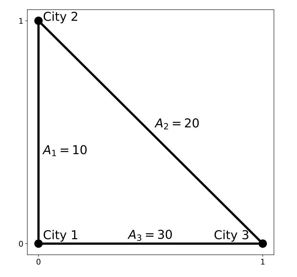 城市和高速公路如图 B.1 所示。通过在 $S$ 中选择城市 1、2 和 3,吸引力得分为 $10 + 20 + 30 - 10^6 \times 0^2 = 60$。