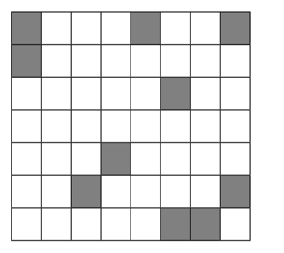 例如,图 D.1 展示了一个 $7 \times 8$ 的均匀 bánh bò hấp 组合,其中阴影单元格代表红色 bánh bò hấp,未阴影单元格代表白色 bánh bò hấp。图 D.2 显示了所有四个 $6 \times 7$ 子网格都包含 6 个红色块和 36 个白色块。