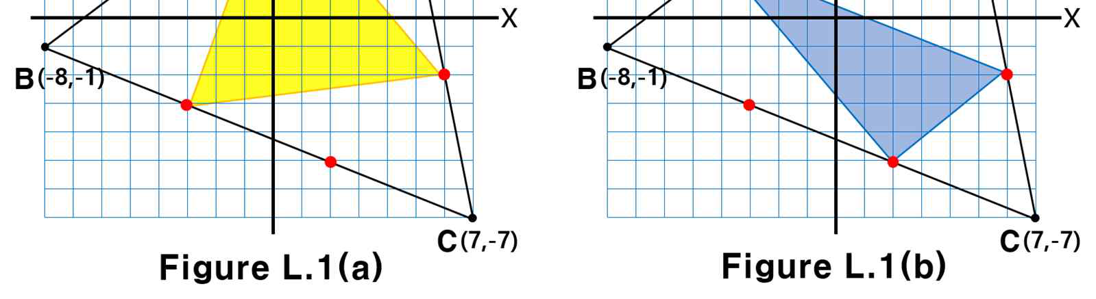 例如,如下图所示,如果给定三角形的三个顶点坐标分别为 $(4, 8)$、$(-8, -1)$ 和 $(7, -7)$,则图 L.1(a) 中所示的黄色三角形是满足条件的所有三角形中面积最大的,而图 L.1(b) 中所示的蓝色三角形是面积最小的。