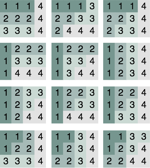 有一个 $n\times m$ 的网格,你希望用带编号的3-联通块(triomino,即俄罗斯方块中的那种联通块,3-长条形或L形)覆盖整个网格。这些3-联通块需要使用 $1$ 到 $nm/3$ 编号。另外,如果两个3-联通块 $X$、$Y$ 满足 $X$ 中存在任意一个格子处于 $Y$ 中某个格子的正左方或正上方,则必须有 $X$ 的编号小于 $Y$ 的编号。