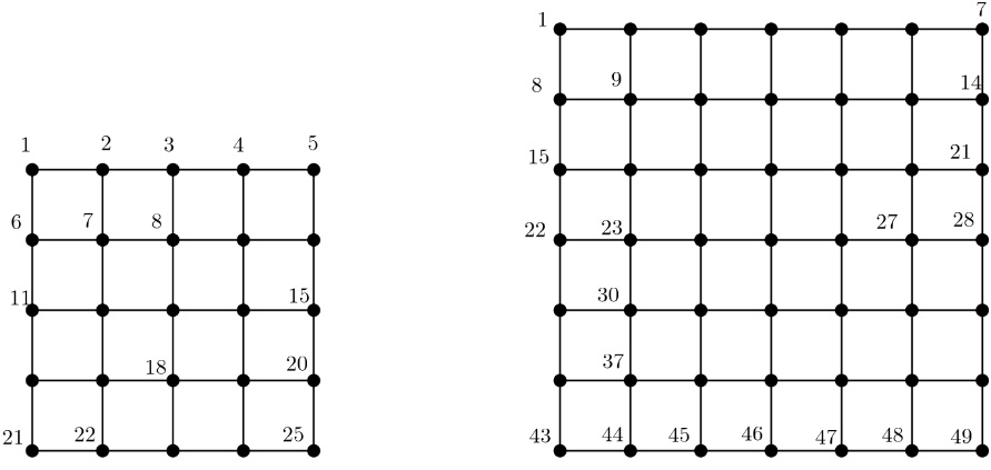 我们有一个网格图 $G(n, n)$,其中 $n$ 是 $x$ 轴和 $y$ 轴上的顶点数,即行数和列数。图 $G(n, n)$ 的顶点按行优先顺序从 1 到 $n^2$ 编号;从左上角的顶点开始,逐行从上到下遍历,在每一行内从左到右遍历。图 1 展示了两个示例 $G(5, 5)$ 和 $G(7, 7)$ 及其顶点编号。