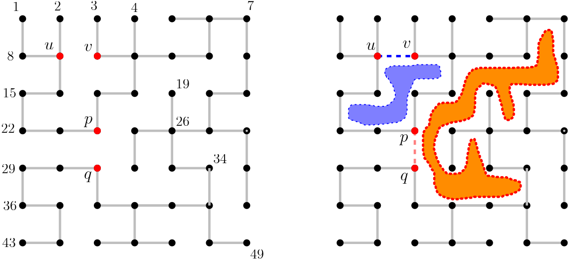 给定 $G(n, n)$ 的一棵生成树 $T$。图 2 左侧展示了 $G(7, 7)$ 的一棵生成树 $T$。如果我们添加一条不属于 $T$ 的 $G(n, n)$ 边(称为非树边),则会恰好形成一个简单环。我们将该环所围成的区域定义为“湾”(bay)。非树边与湾之间存在一一对应关系,即每一条非树边对应恰好一个湾。湾的面积定义为该环所围成的 $1 \times 1$ 单位格的数量。图 2 右侧展示了通过添加两条非树边 $(u, v)$ 和 $(p, q)$ 所形成的两个湾(分别用蓝色和橙色标出)。注意,由 $(u, v)$ 和 $(p, q)$ 形成的两个湾的面积分别为 4 和 12。