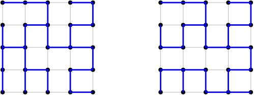 图 3 展示了 $n = 5$ 时网格图的两棵生成树,它们分别是样例输入和输出对应的图。