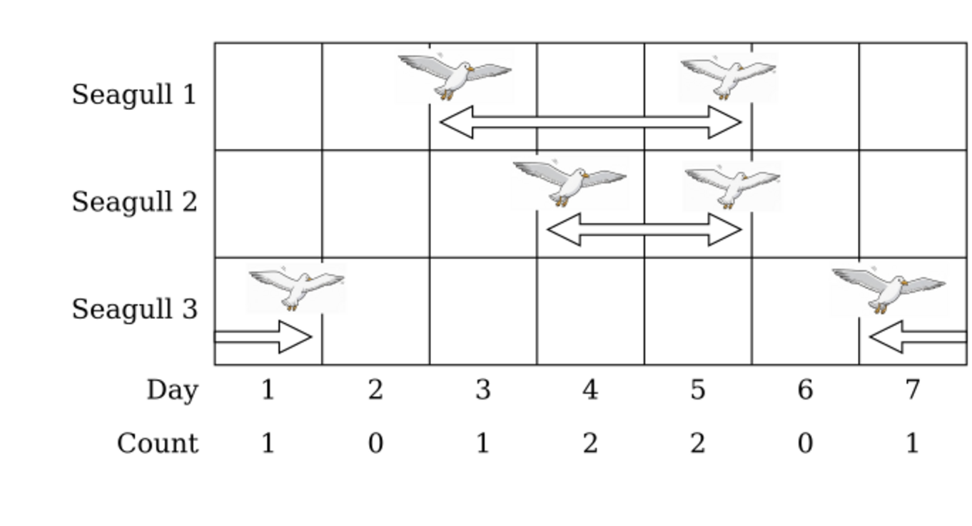下图描绘了样例输出 1 中三只海鸥的访问时间表。请注意,第三只海鸥跨年停留在岛上。
