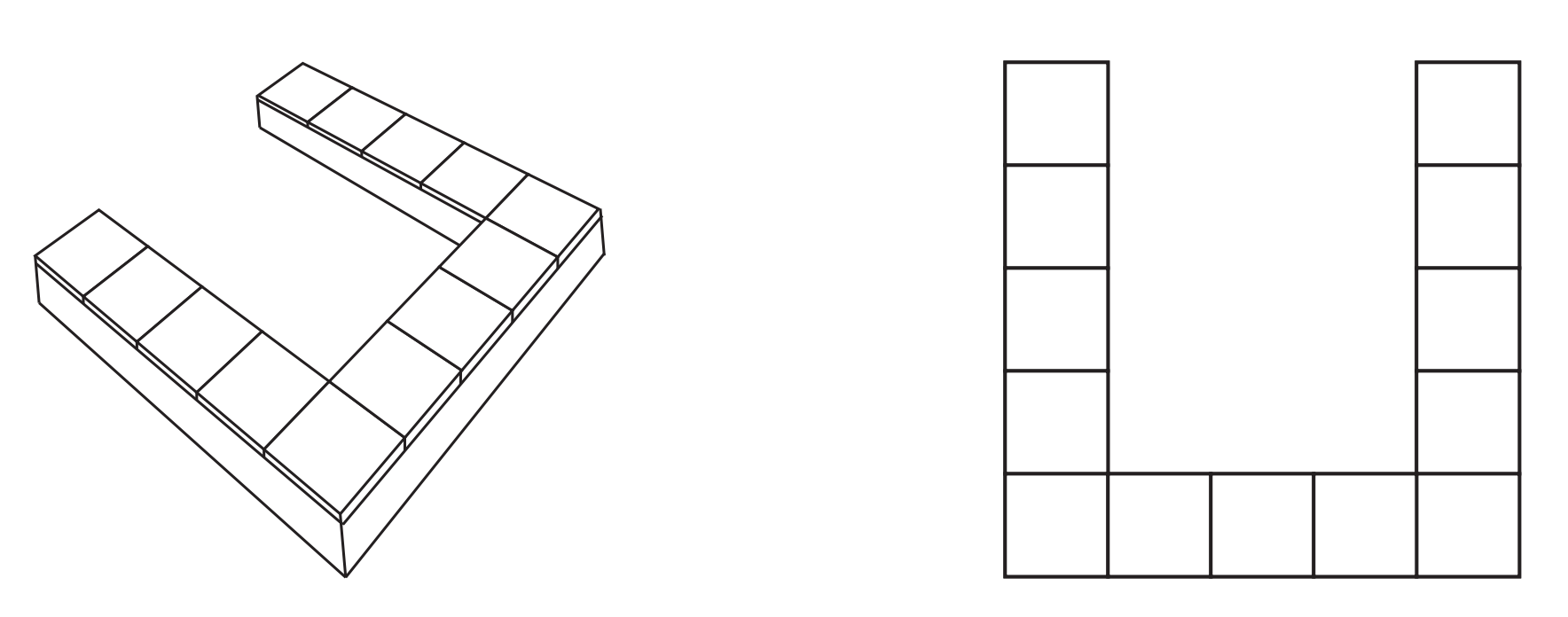 你总觉得池塘太大了,想要用谷仓里的面板覆盖其中的一些区域。这些面板的大小和形状完全相同,由排列成 U 型的一平方米木板组成。面板的整体尺寸为 $k$ 米乘 $k$ 米,在正方形的三条边上共有 $3k - 2$ 块木板。其余的 $(k - 2) \times (k - 1)$ 矩形区域是空的。图 H.1 展示了一个大小为 $k = 5$ 的面板。