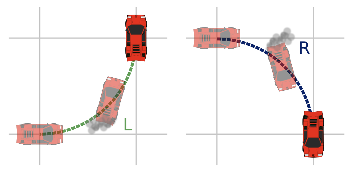 我们将宇宙建模为二维笛卡尔平面,漂移之王汽车的位置由一个点表示,该点具有一个指向特定方向的“车头”。漂移之王自然只通过漂移来移动。他的车可以通过两种方式之一移动,每种方式由一个特定的符号表示: