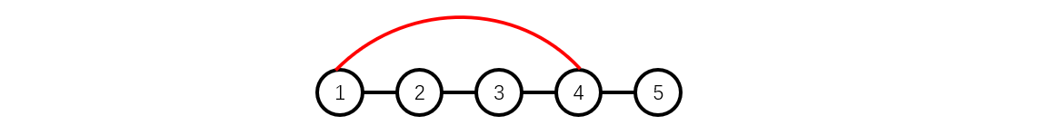样例中的图如下图所示,黑色为树边,红色为额外边,共有 $18$ 个点对使得 Speike 无法获胜,其中 Tom 和 Speike 的初始位置分别是 $(1,2),(1,3),(1,4),(1,5),(2,1),(2,3),(2,4),(2,5),(3,1)(3,2),(3,4),(3,5),(4,1),(4,2),(4,3),(4,5),(5,1),(5,2)$。