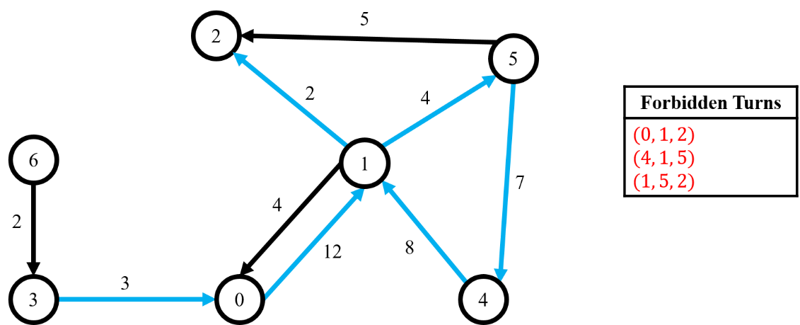 请看下图中的示例。每条边的代价标注在边旁,禁止转弯列表在右侧框中。从顶点 3 到顶点 2 的避开禁止转弯的最短路径是 $(3, 0, 1, 5, 4, 1, 2)$,在下图中用蓝色箭头标出。该最短路径的距离为 $3 + 12 + 4 + 7 + 8 + 2 = 36$。注意,我们不能选择更短的路径 $(3, 0, 1, 2)$ 和 $(3, 0, 1, 5, 2)$,因为它们分别包含了禁止转弯 $(0, 1, 2)$ 和 $(1, 5, 2)$。