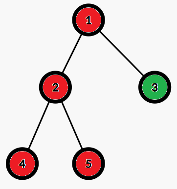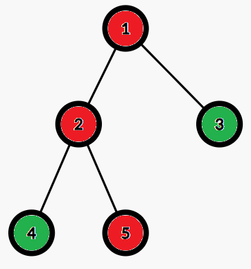 我们用红色表示1,绿色表示2,这是初始的各点颜色,此时询问节点2的答案是5: